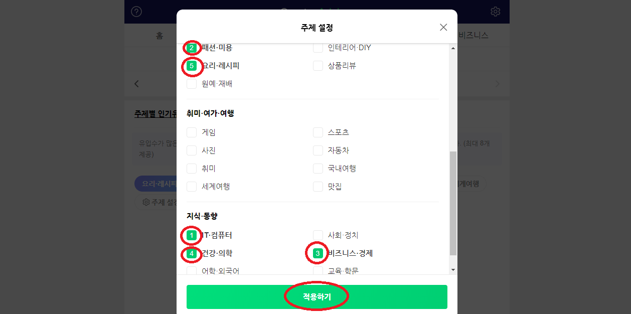 네이버 블로그 우상단- 메뉴-통계-크리에이터 어드바이저-트랜드-주제설정- 주제별인기유입검색어 확인-키워드 선정