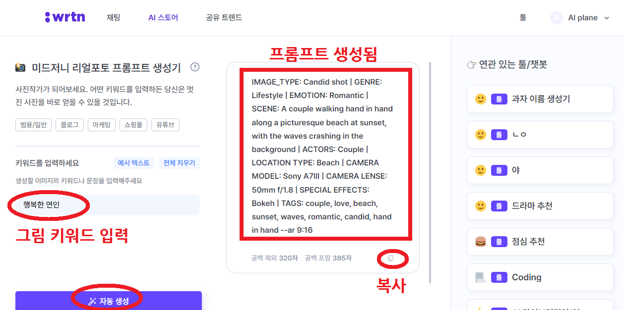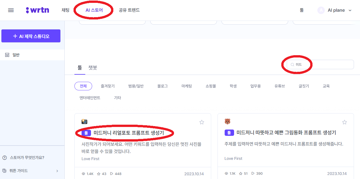 뤼튼-AI스토어-툴 검색-미드저니 검색-미드저니 리얼포도 프롬프트 생성기