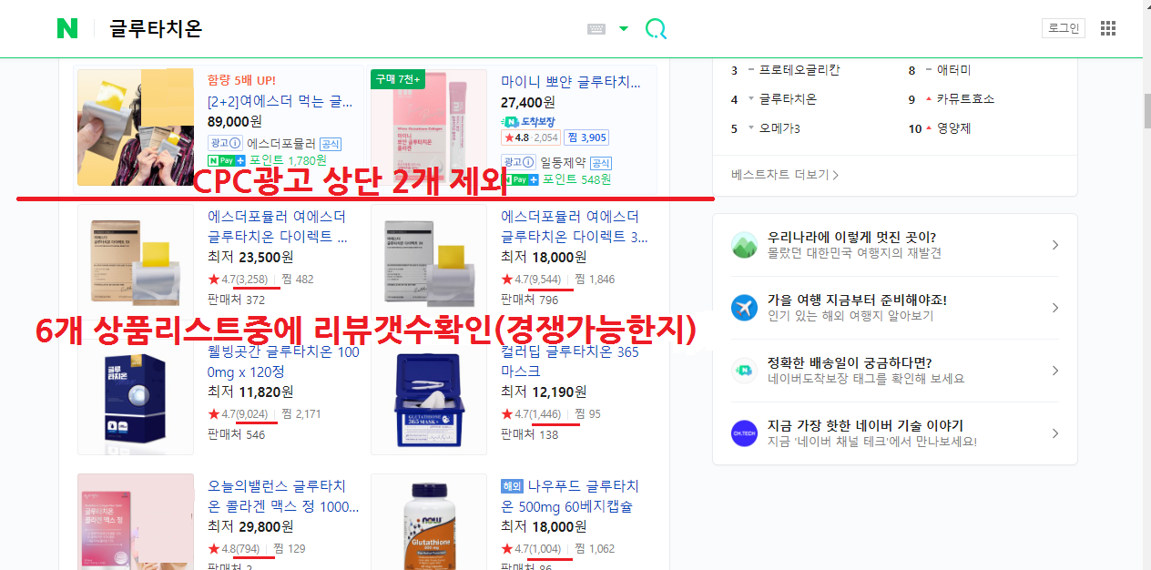 -네이버쇼핑 섹션에서 8개 상품리스트중에 상위 2CPC광고 제외하고 6개 상품들의 리뷰갯수 확인(경쟁 가능한지, 리뷰20개 이하면 경쟁가능)