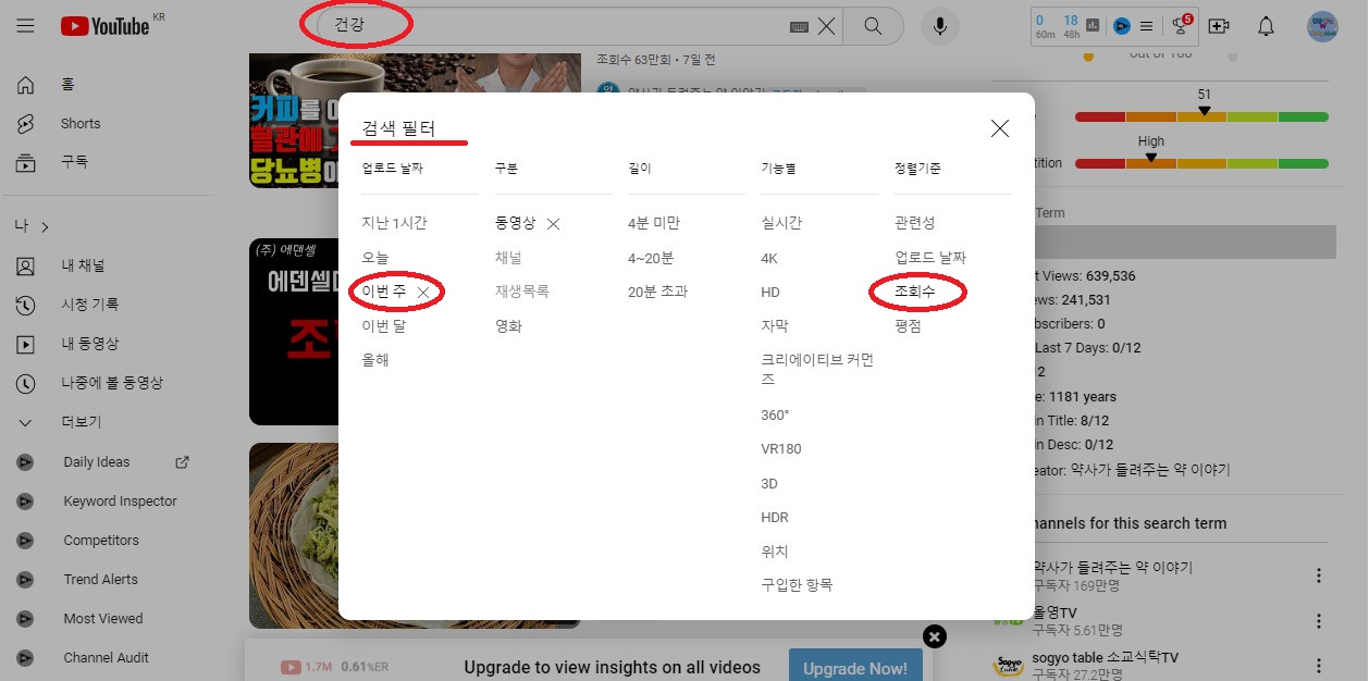 2. 검색필터- 업로드 날짜: 이번주 (오늘)-정령기준: 조회수