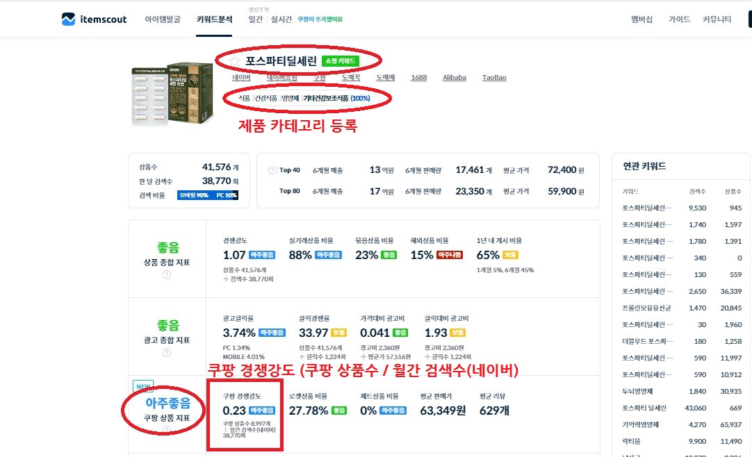 3. 포스파티딜세린 키워드 검색하여쿠팡 경쟁강도 확인 (쿠팡 상품수 / 월간 검색수 (네이버)