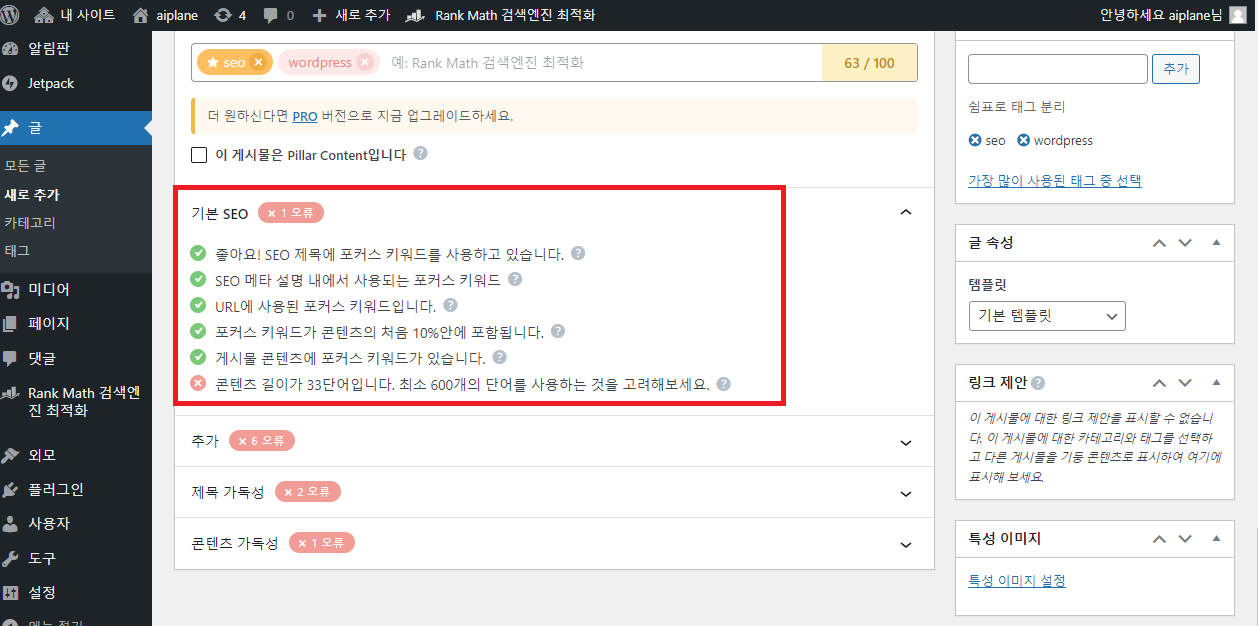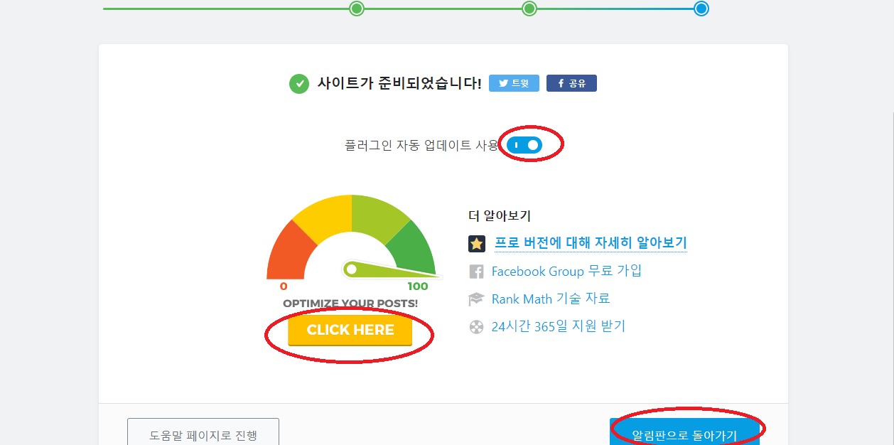 설치-활성화-쉬운-시작마법사-구글 서비스연결-플러그인 자동업데이트-SEO점수 확인- SEO check list확인