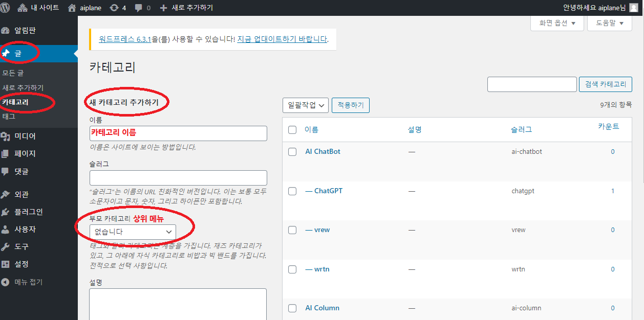 새 카테고리 추가하기-이름 설정-부모 카테고리 설정 (상위 메뉴 선택)