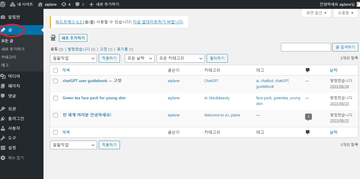 워드프레스 로그인-좌측메뉴 글-카테고리