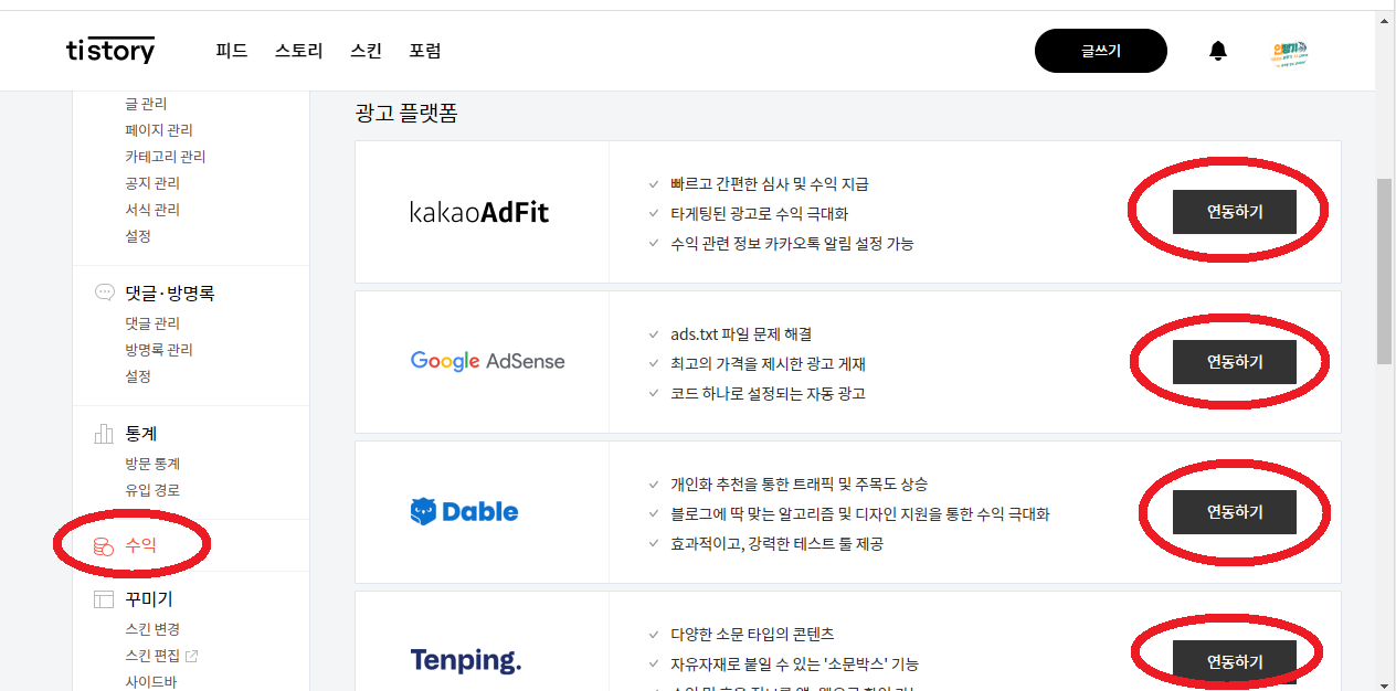 tistory 광고플렛폼 수익-애드핏, 애드센스, 데이블, 텐핑